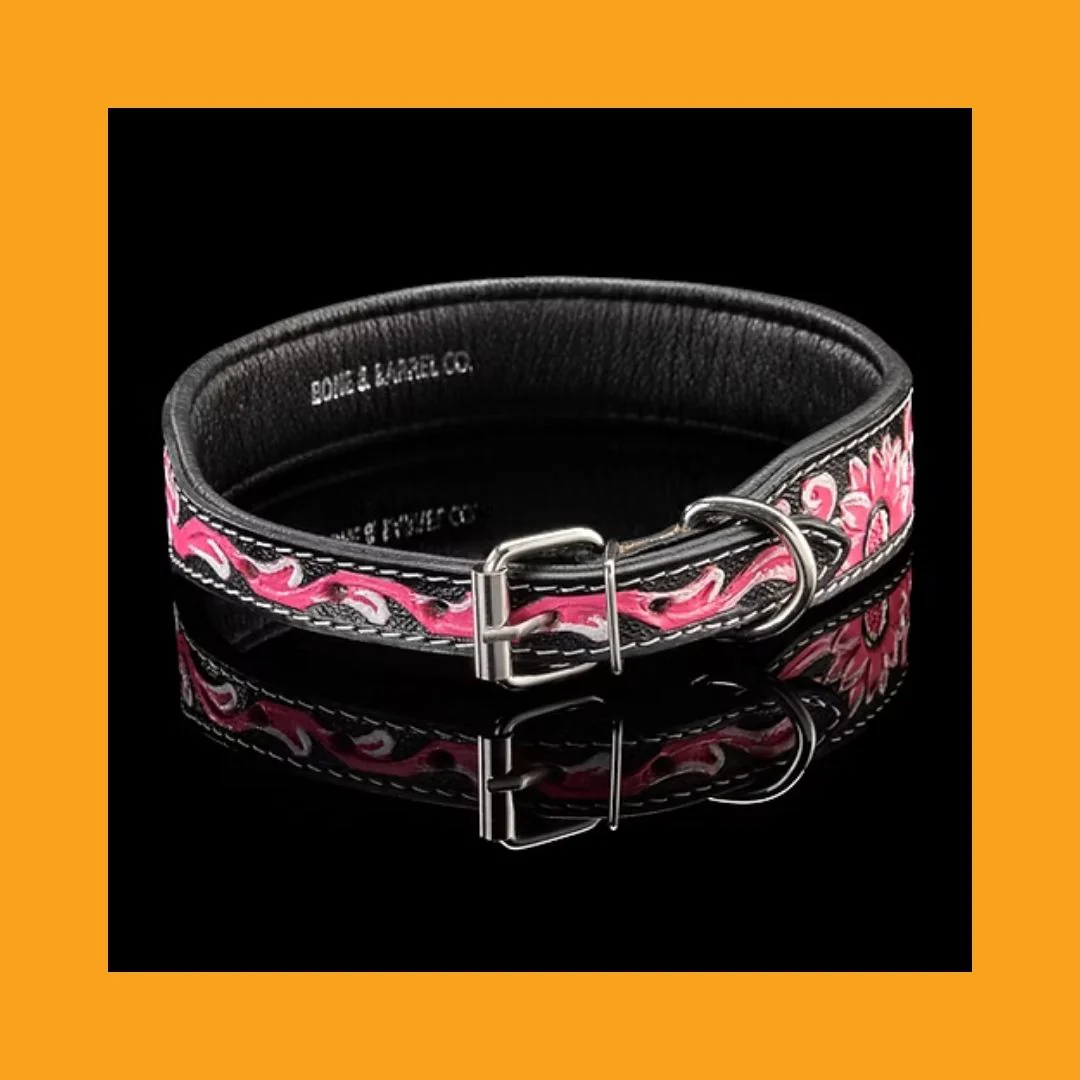 Brightly designed hot pink floral hand-carved & painted onto black leather with white accents and white stitching on leather edges. Custom, matching 5ft leash contain same designs throughout.