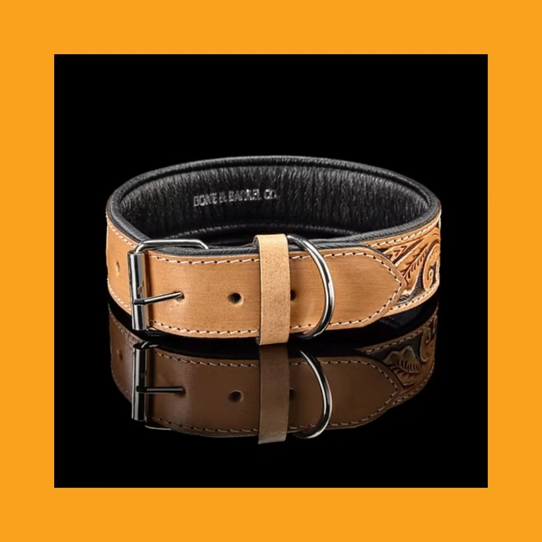 Lighter tan leather with hand-tooled designs accented by a black background. The Cowboy collar is slightly wider and heavy-duty compared to the āSaddleā collection.Ā Stunning on large dogs. Paired with custom, matching 5-foot leash.Ā